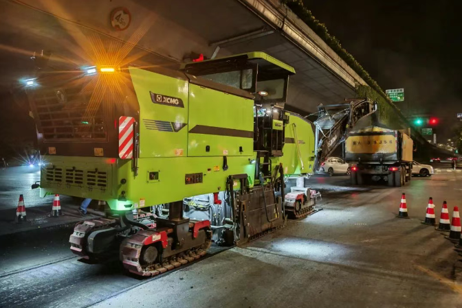 施工成果:此次項(xiàng)目使用徐工新能源銑刨機(jī)XM2005HEV進(jìn)行瀝青銑刨,銑刨寬度可達(dá)2米,適用于大面積銑刨作業(yè)。設(shè)備配備智能控制系統(tǒng),可精準(zhǔn)調(diào)節(jié)銑刨深度,人機(jī)協(xié)同更高效,確保施工精度達(dá)到毫米級(jí)。創(chuàng)新采用混合動(dòng)力系統(tǒng),將高效的燃油動(dòng)力與清潔的電力驅(qū)動(dòng)相結(jié)合,提供強(qiáng)勁動(dòng)力,提高作業(yè)效率,縮短施工時(shí)間,盡快恢復(fù)正常通行。新能源技術(shù)的應(yīng)用,顯著降低噪音、能耗與排放,大大減少夜間施工對(duì)附近街區(qū)居民影響。同時(shí)全車各方位配備LED照明燈,保證夜間施工視線,保障施工人員、施工設(shè)備以及行車行人的安全。